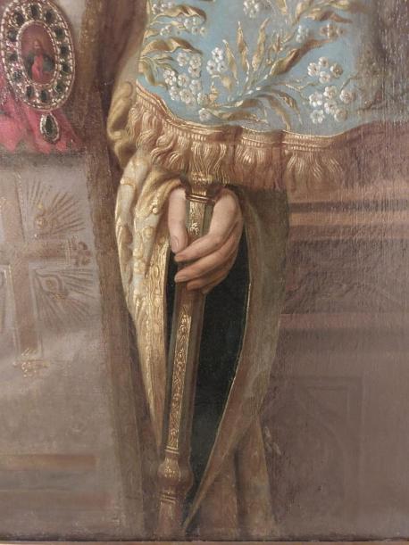 Pe cap este reprezentat având mitra arhierească de formă bizantină, frumos împodobită cu broderie aurie, pietre prețioase și semiprețioase, iar de sub mitră, se vede cum cade pe ambii umeri părul alb-grizonat, desprins.